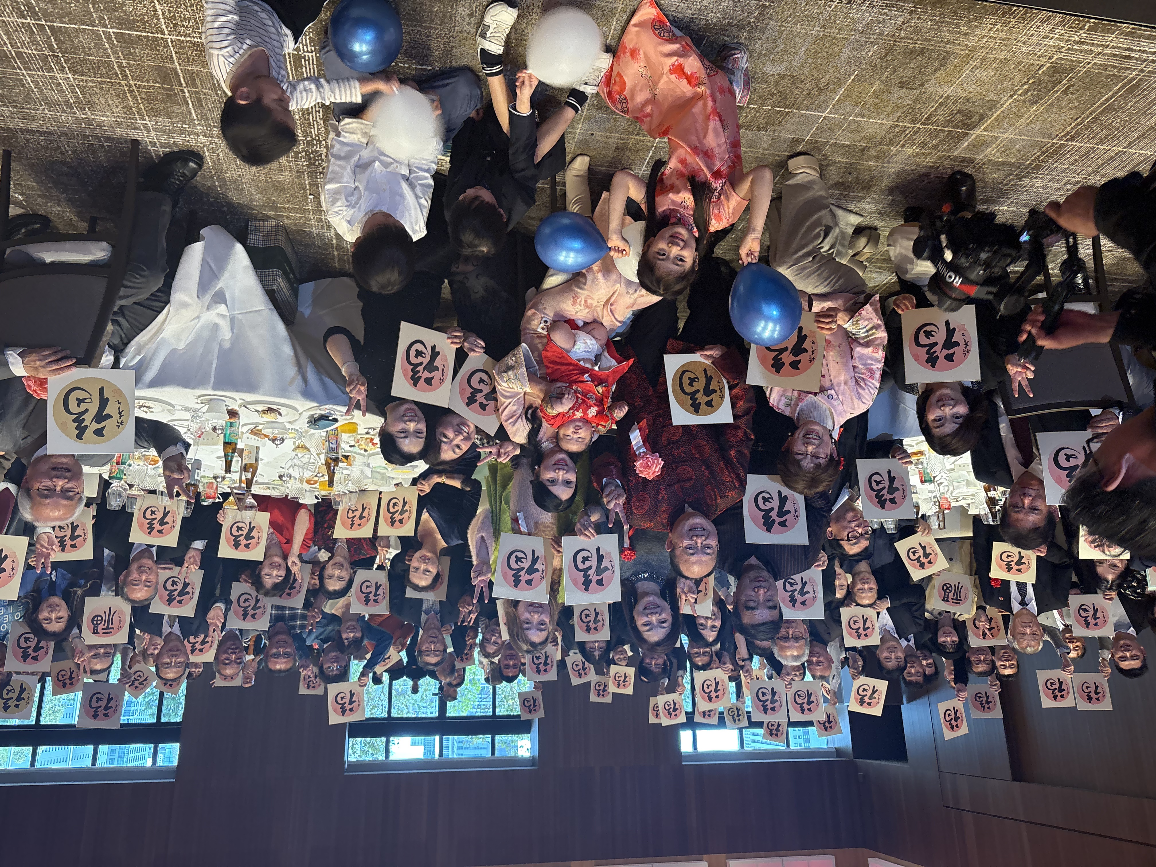何さんが日本に留学した時の保証人小仲宏さん、共に会社を立ち上げた三並啓作さん、来日後の様々な学びを指導してくれた四国大学大学院太田剛教授、甲南大学胡金定教授、そして共に学んだ仲間—京都大学ELP7期代表で同窓会会長の佐藤幸恵さんなど、日本での奮闘を支え見守ってきた人々が壇上に立ち、浩君の誕生を祝った。遠くは中国からお祝いに駆けつけたゲストも。日中の芸術家らは歌や演奏などで会場を盛り上げた。書家でもある何さんは来場者全員に「福」の文字の書を贈り、すべての人々の幸せを祝した。